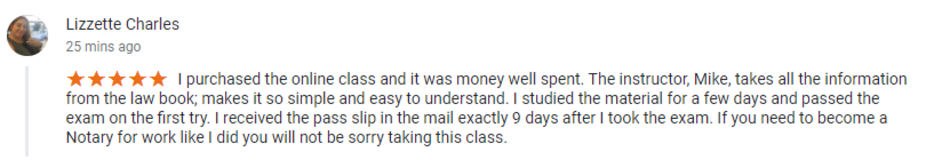 I just would like to thank you for creating such a wonderful Notary Public course for New York. I attended your online course and used your advice on taking the quizzes over and over. I took my notary public exam in Newburgh, NY on August 9th, and received my pass slip in the mail on Friday, August 19th. I was able to retain your online course very easily. I'm going to recommend it to everyone I know who is looking to become a NY Notary Public. Thank you very much again.